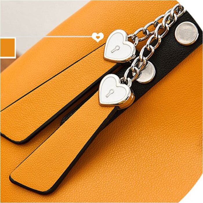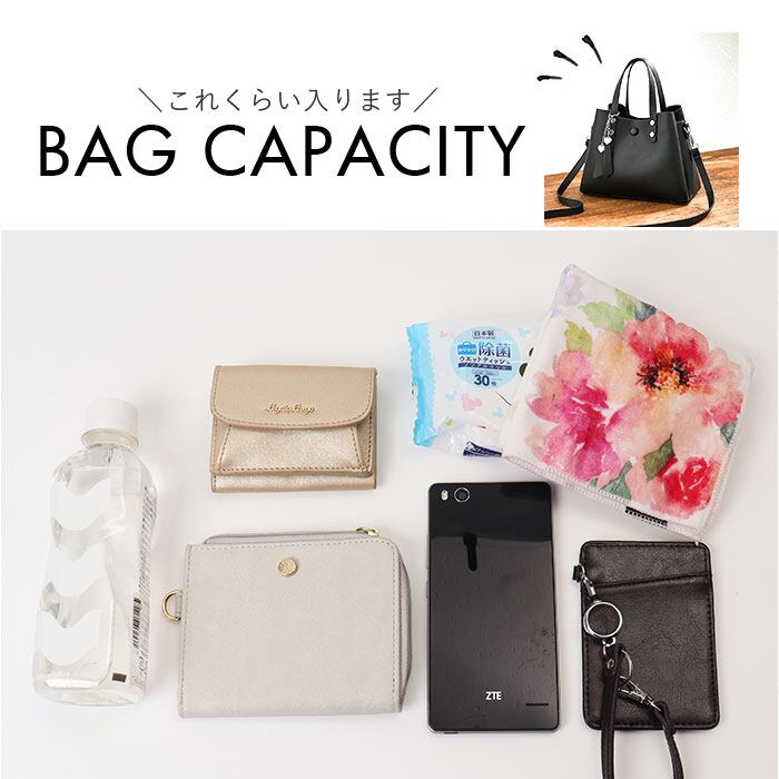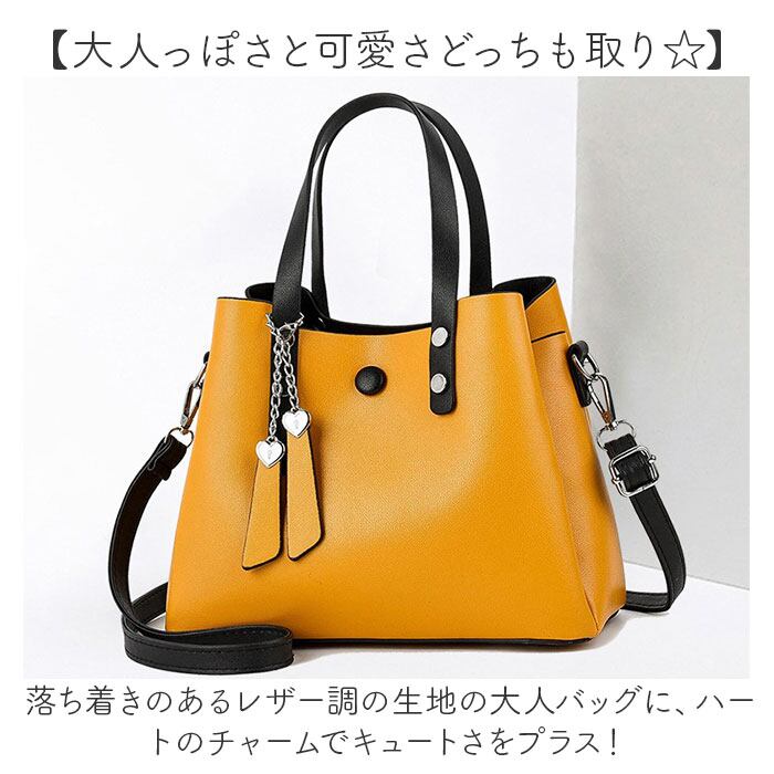 ・落ち着きのあるレザー調の生地の大人バッグに、ハートのチャームでキュートさをプラス!