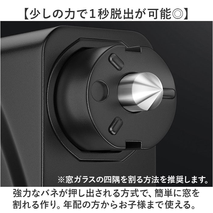 ・強力なバネが押し出される方式で、簡単に窓を割れる作り。年配の方からお子様まで使える。