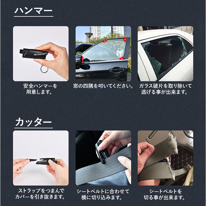・シートベルトカッターと窓ガラス用ハンマーが1つになった「車用 脱出用ハンマー」が登場。