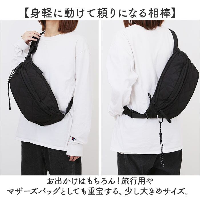 ・ショルダーの長さを調節して斜め掛け。バックル式で、いつでもスムーズに着脱。