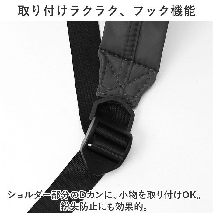 ・ショルダー部分のDカンに、小物を取り付けOK。紛失防止にも効果的。
