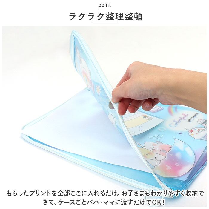 ・もらったプリントを全部ここに入れるだけ。お子さまもわかりやすく収納できて、ケースごとパパ・ママに渡すだけでOK!