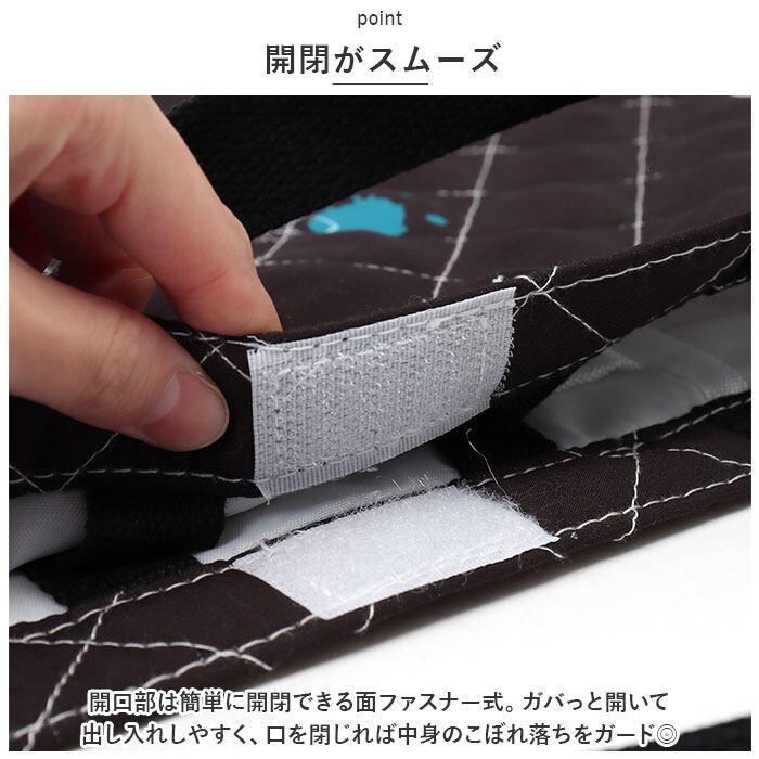 ・開口部は簡単に開閉できる面ファスナー式。ガバっと開いて出し入れしやすく、口を閉じれば中身のこぼれ落ちをガード◎