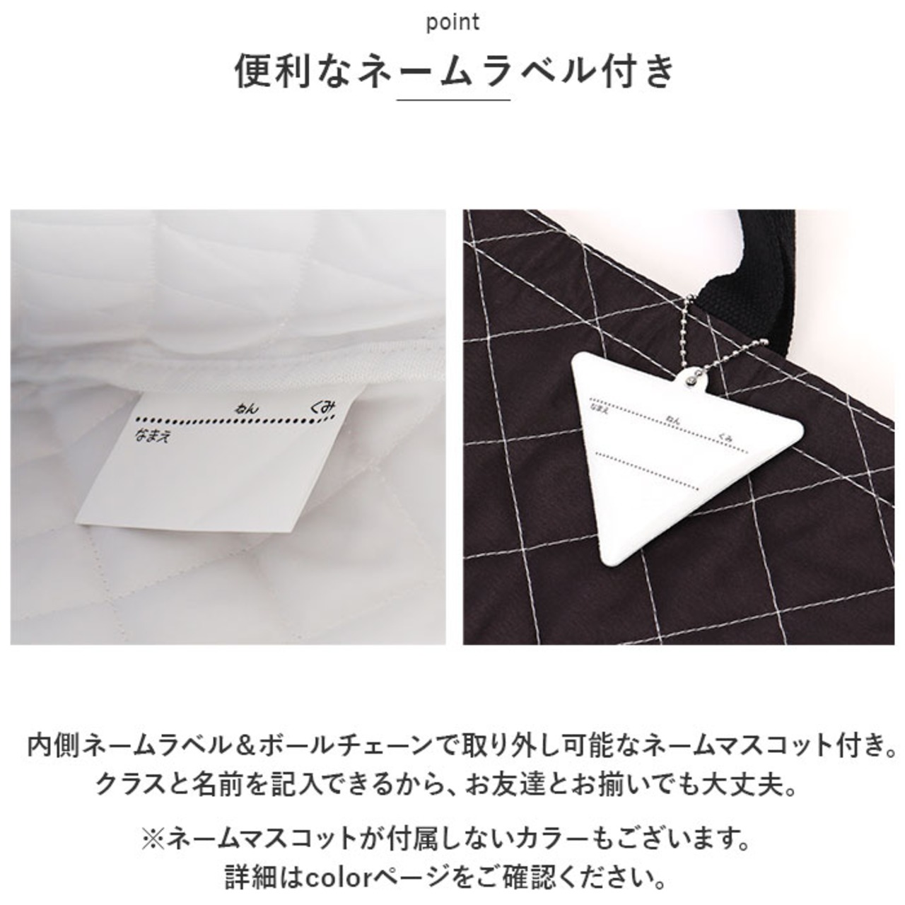 ・内側ネームラベル&ボールチェーンで取り外し可能なネームマスコット付き。クラスと名前を記入できるから、お友達とお揃いでも大丈夫。