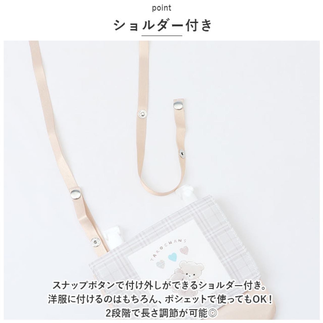 ・スナップボタンで付け外しができるショルダー付き。洋服に付けるのはもちろん、ポシェットで使ってもOK!