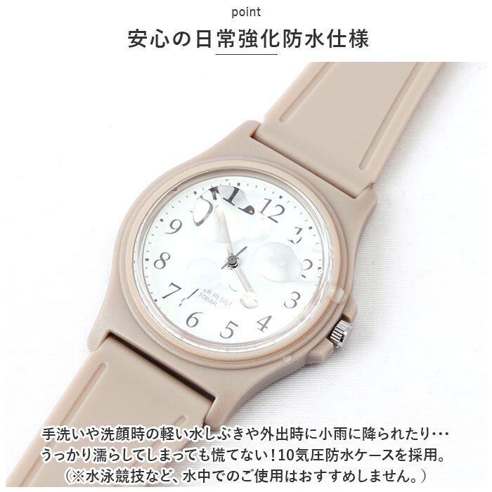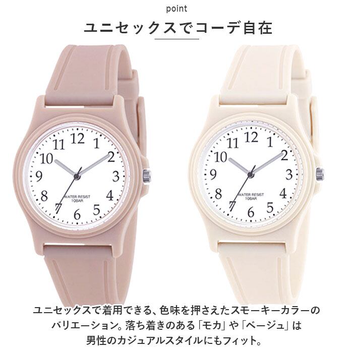 ・小ぶりなケースもベルトもナチュラルなくすみカラーで統一したプラケースウォッチ。普段使いでもオフィスでも使いやすい軽い付け心地がポイント。