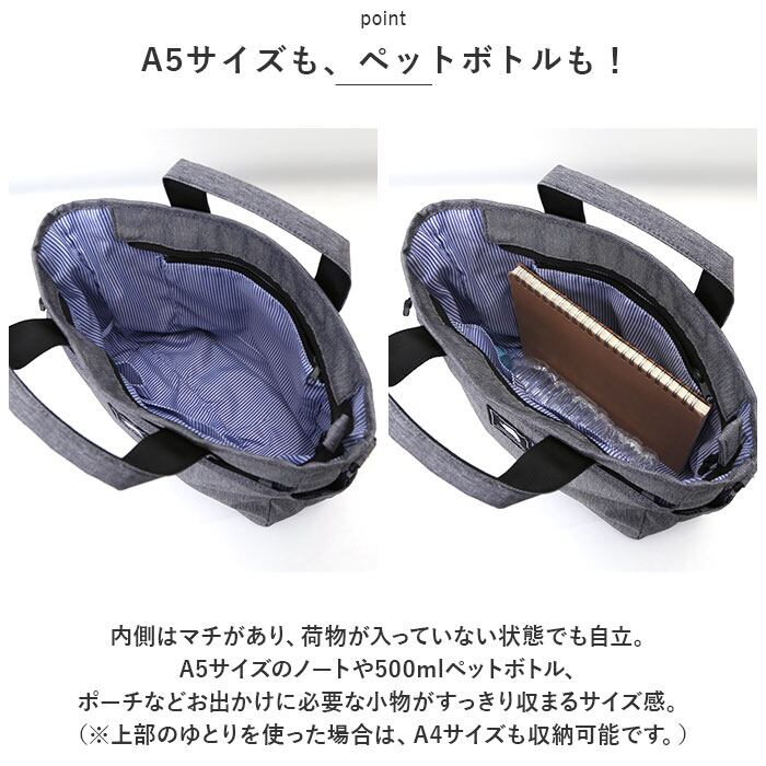 ・内側はマチがあり、荷物が入っていない状態でも自立。A5サイズのノートや500mlペットボトル、ポーチなどお出かけに必要な小物がすっきり収まるサイズ感。(※上部のゆとりを使った場合は、A4サイズも収納可能です。)