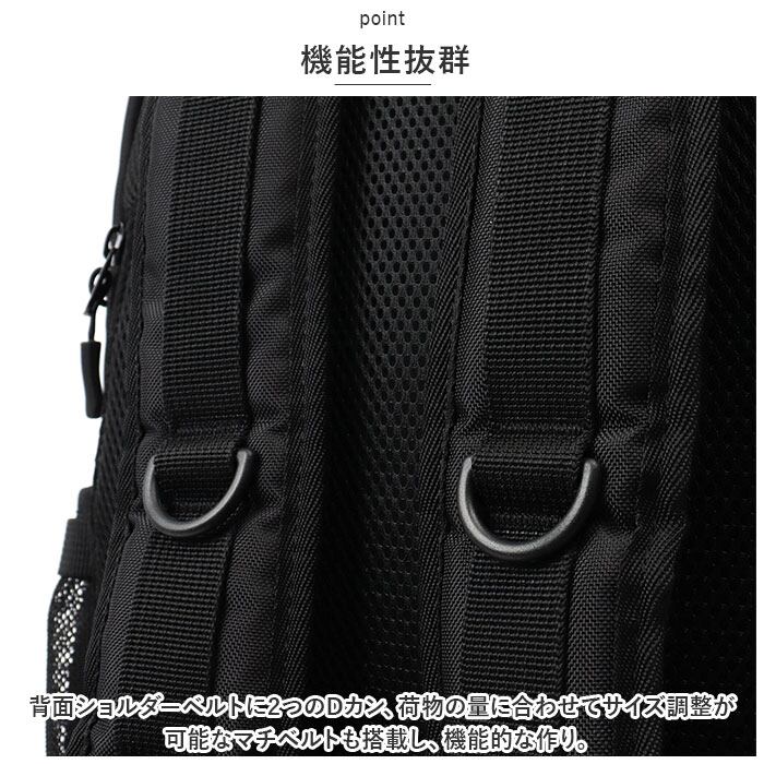 ・背面ショルダーベルトに2つのDカン、荷物の量に合わせてサイズ調整が可能なマチベルトも搭載し、機能的な作り。