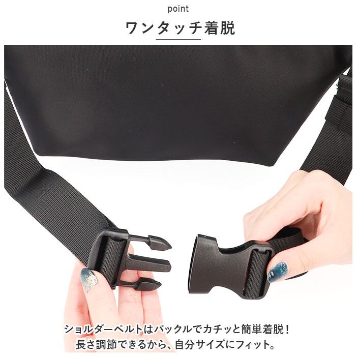 ・ショルダーベルトはバックルでカチッと簡単着脱!長さ調節できるから、自分サイズにフィット。