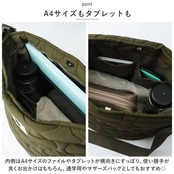 ・内側はA4サイズのファイルやタブレットが横向きにすっぽり。使い勝手が良くお出かけはもちろん、通学用やマザーズバッグとしてもおすすめ◎