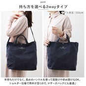 ・手持ちだけでなく、長めのハンドルを使って肩掛けや斜め掛けもOK。ショルダー仕様で両手が空くので、マザーズバッグにも最適♪