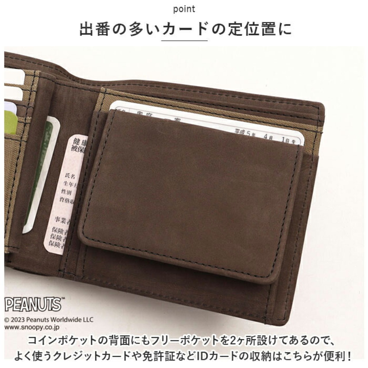 ・コインポケットの背面にもフリーポケットを2ヶ所設けてあるので、よく使うクレジットカードや免許証などIDカードの収納はこちらが便利!