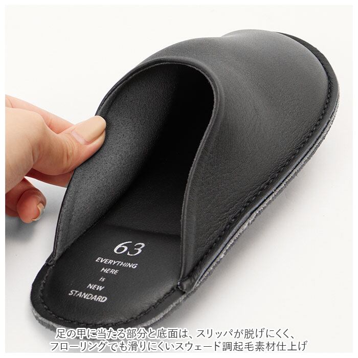 ・足の甲に当たる部分と底面は、スリッパが脱げにくく、フローリングでも滑りにくいスウェード調起毛素材仕上げ。