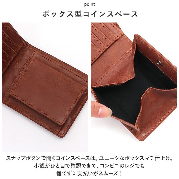 ・スナップボタンで開くコインスペースは、ユニークなボックスマチ仕上げ。小銭がひと目で確認できて、コンビニのレジでも慌てずに支払いがスムーズ!