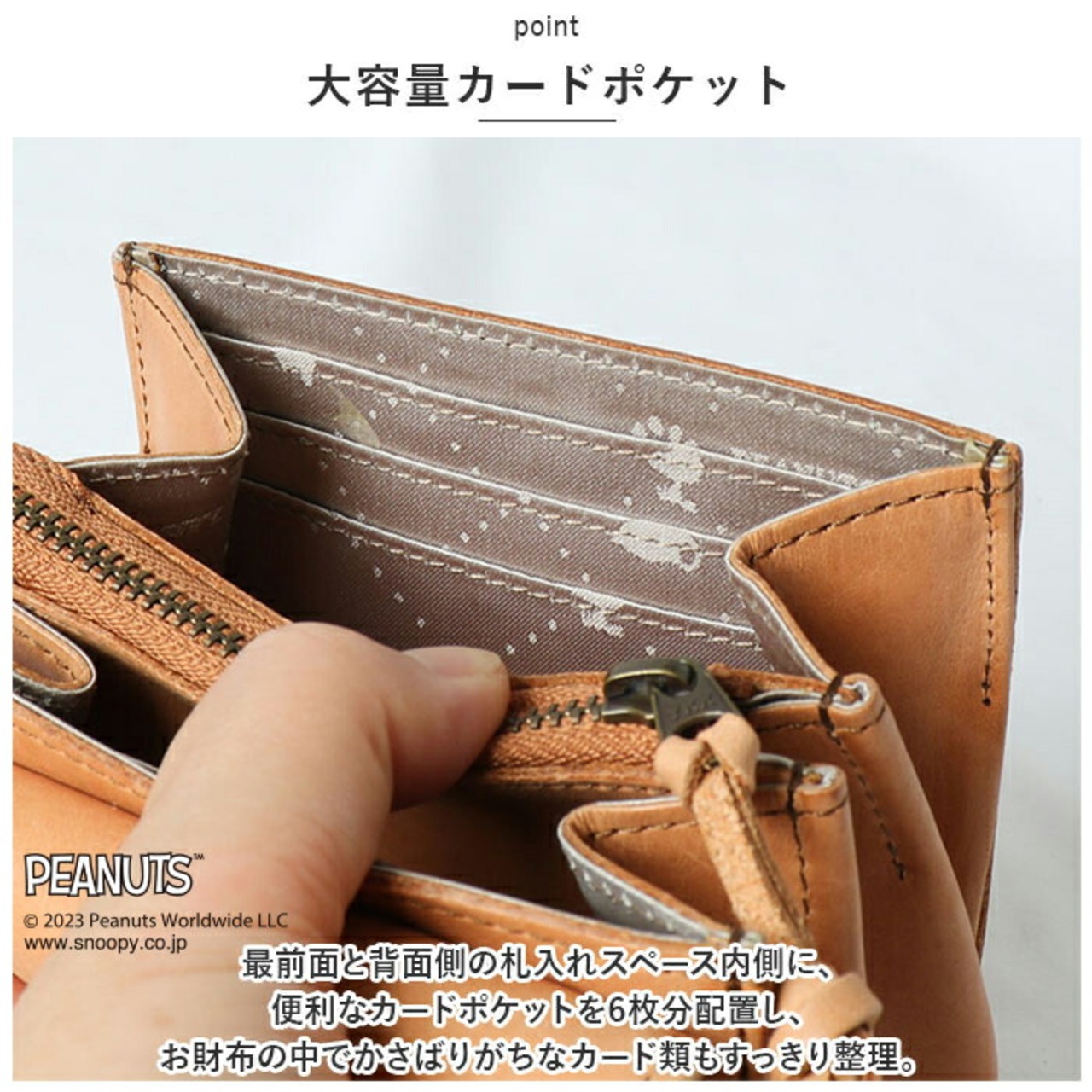 ・小銭がこぼれ落ちる心配のないファスナー式コインポケットは、小ぶりな見た目以上にコインが収納できるマチ広設計。SNOOPYの横顔と肉球マークをあしらった裏地がさりげないオシャレポイント♪