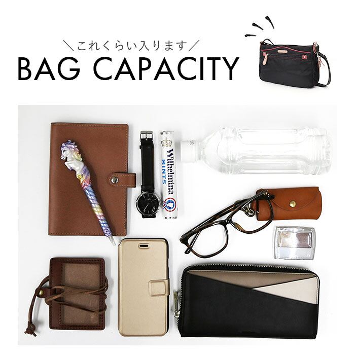 ・メインルームには長財布や500mlペットボトル、A5のリングノート等の収納が可能。コンパクトでスリムな見た目ながら沢山入る◎