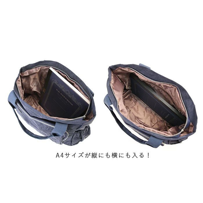 ・メイン収納はファスナー式。A4サイズが縦にも横にも入るサイズ感!ファスナーポケット×1・オープンポケット×2はスマホ等の収納に便利。