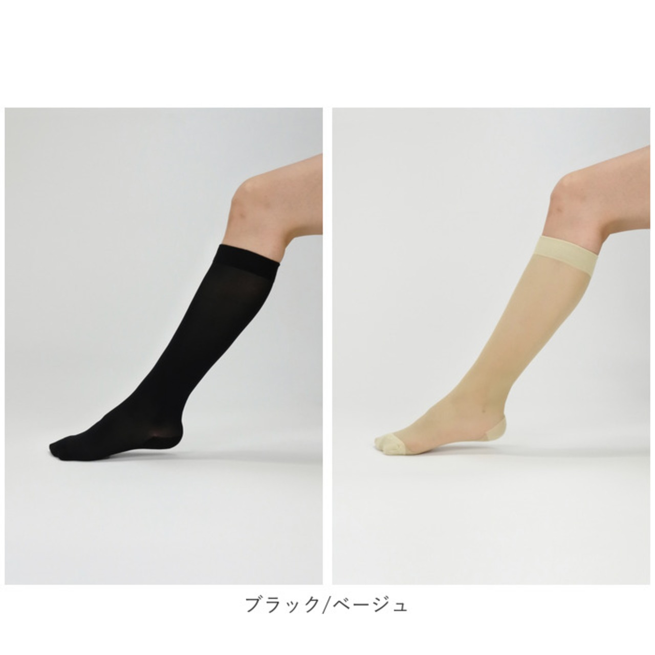 ・靴下に使う強度のある弾性糸を使用!足首側から13hPa、11hPa、5hPaと3段階の着圧機能付きで、ほどよく引き締めてくれる薄手のハイソックス。