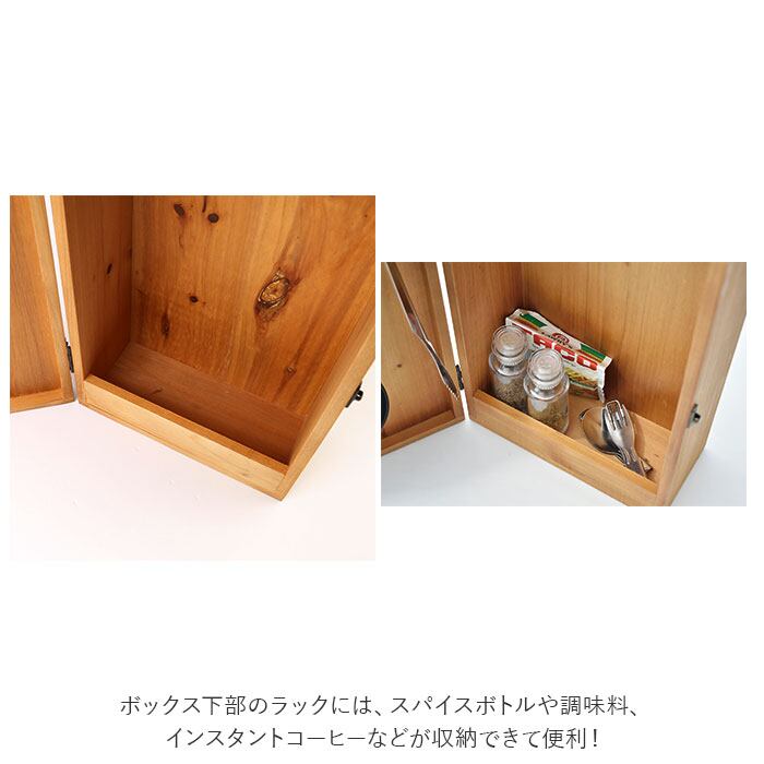 ・ボックス下部のラックには、スパイスボトルや調味料、インスタントコーヒーなどが収納できて便利!