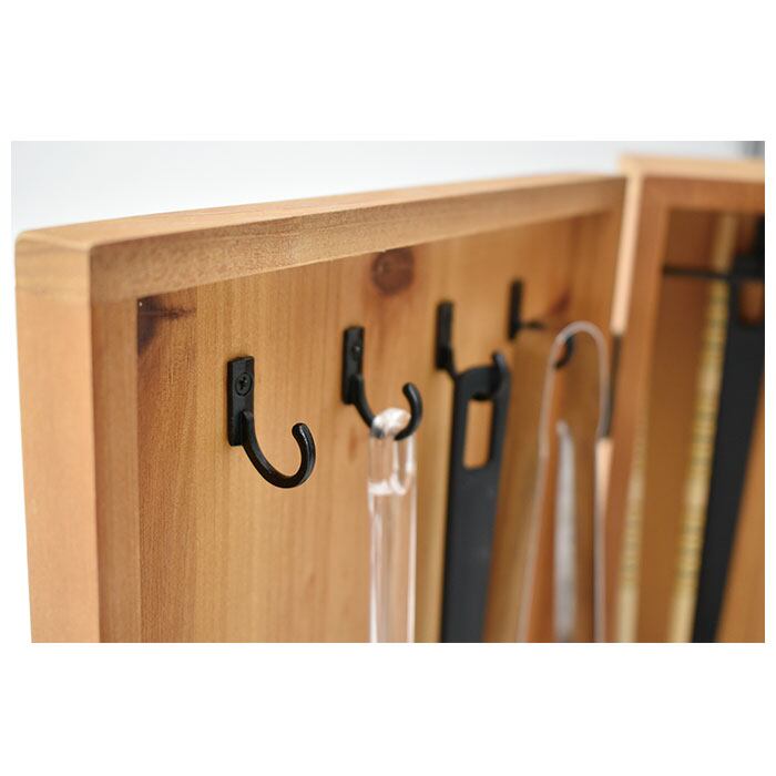 ・ボックス上部にアイアンのハンガーバーを渡してあり、お手持ちのS字フックやカラビナを活用すれば、カップや小物類を引っ掛けて収納可能!