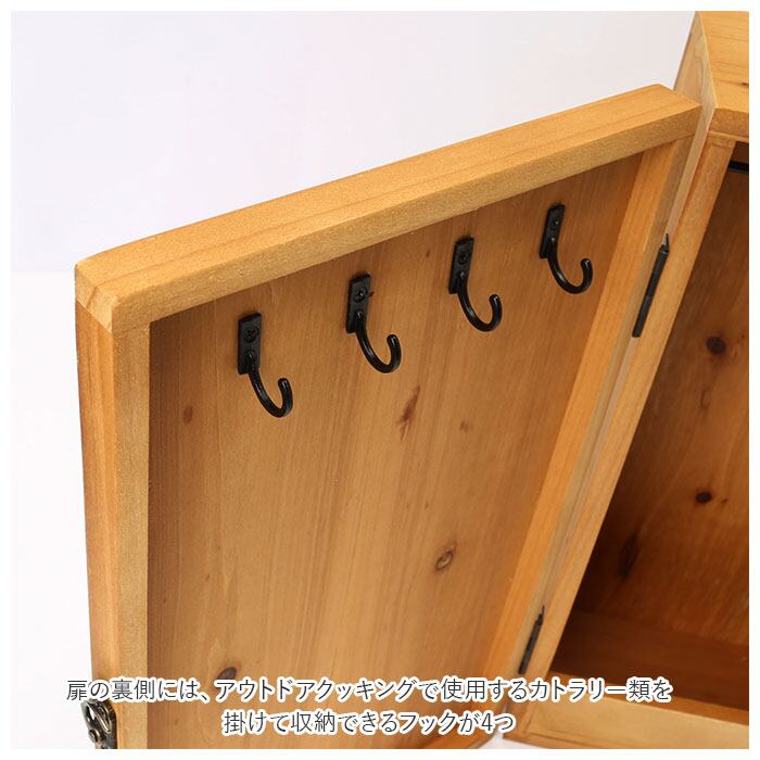 ・右サイドのラッチ金具を外して、扉を開くようにオープン!扉の裏側には、アウトドアクッキングで使用するカトラリー類を掛けて収納できるフックが4つ。
