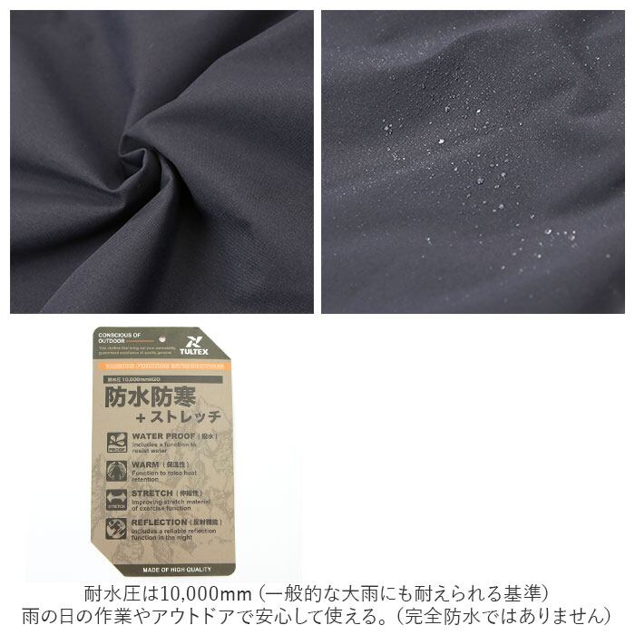 ・耐水圧は10,000mm(一般的な大雨にも耐えられる基準)雨の日の作業やアウトドアで安心して使える。(完全防水ではありません)
