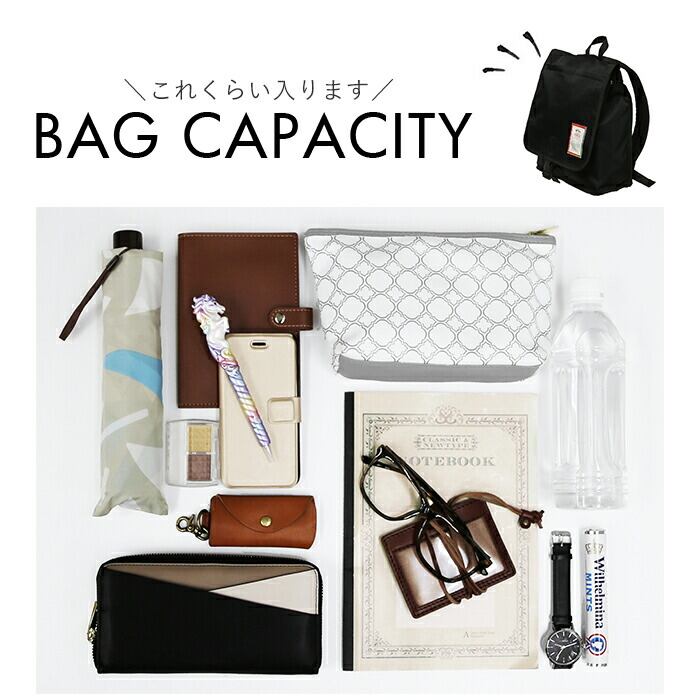 ・メインルームはA4サイズに対応。スリムな見た目ながら、500mlペットボトルや小ぶりな化粧ポーチもすっぽりと収納可能。