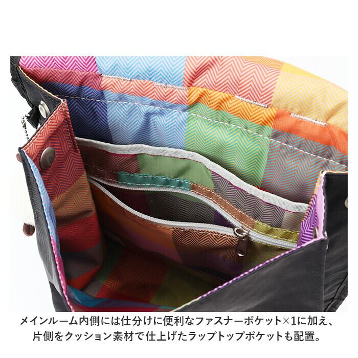 ・メインルーム内側には小物の仕分けに便利なファスナーポケット×1に加え、片側をクッション素材で仕上げたラップトップポケットも配置。