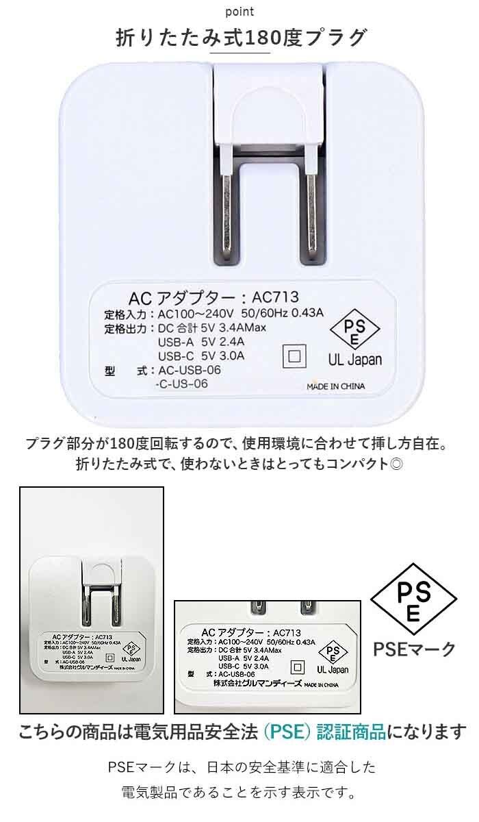 ・スマートフォン、タブレット、モバイルバッテリーなどの充電に使えるACアダプタ。(※Apple製品、Android製品対応)