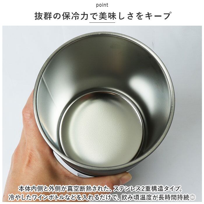 ・本体内側と外側が真空断熱された、ステンレス2重構造タイプ。冷やしたワインボトルなどを入れるだけで、飲み頃温度が長時間持続◎