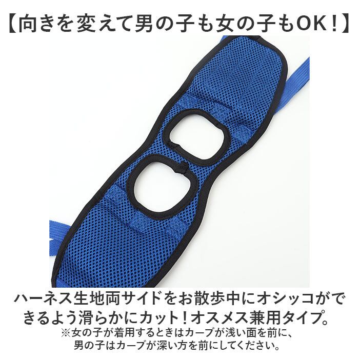 ・ハーネス生地両サイドをお散歩中にオシッコができるよう滑らかにカット!オスメス兼用タイプ。