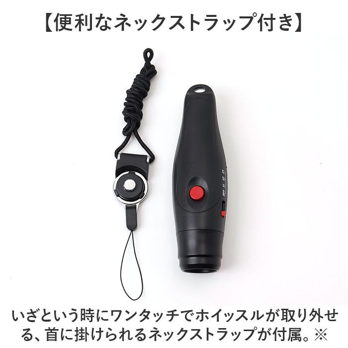 ・いざという時にワンタッチでホイッスルが取り外せる、首に掛けられるネックストラップが付属。