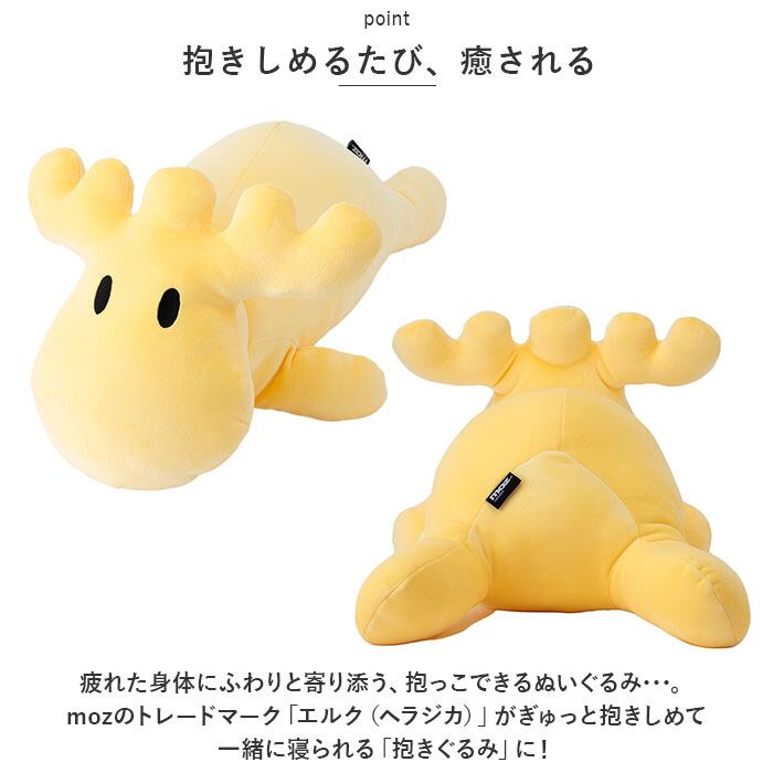 ・疲れた身体にふわりと寄り添う、抱っこできるぬいぐるみ・・・。mozのトレードマーク「エルク(ヘラジカ)」がぎゅっと抱きしめて一緒に寝られる「抱きぐるみ」に!