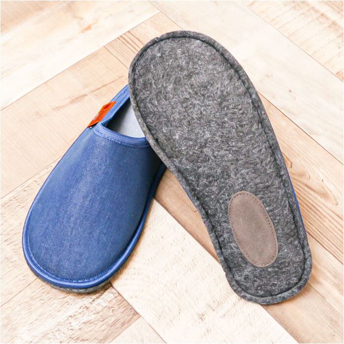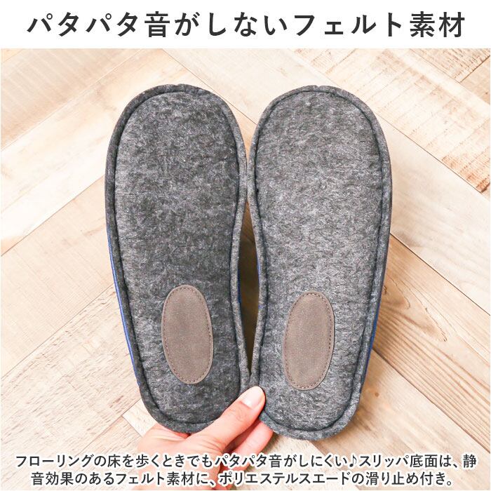 ・フローリングの床を歩くときでもパタパタ音がしにくい♪スリッパ底面は、静音効果のあるフェルト素材に、ポリエステルスエードの滑り止め付き。