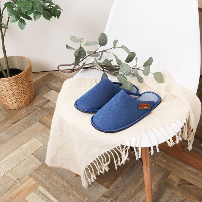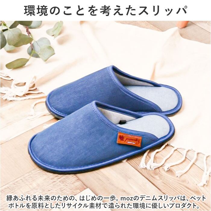 ・緑あふれる未来のための、はじめの一歩。mozのデニムスリッパは、ペットボトルを原料としたリサイクル素材で造られた環境に優しいプロダクト。