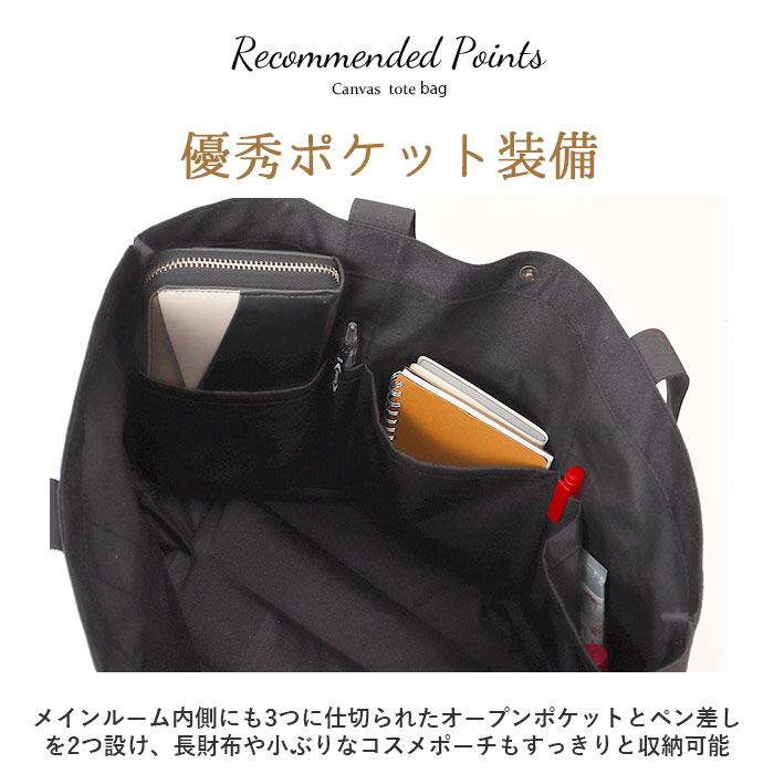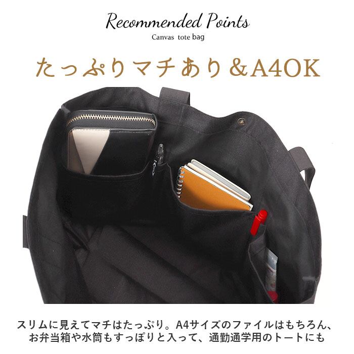 ・スリムに見えて、マチはたっぷり。A4サイズのファイルはもちろん、お弁当箱や水筒もすっぽりと入って、通勤通学用のトートにちょうどいいサイズ。