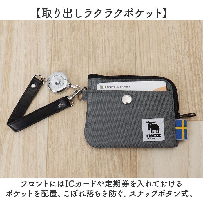 ・フロントにはICカードや定期券を入れておけるポケットを配置。こぼれ落ちを防ぐ、スナップボタン式。