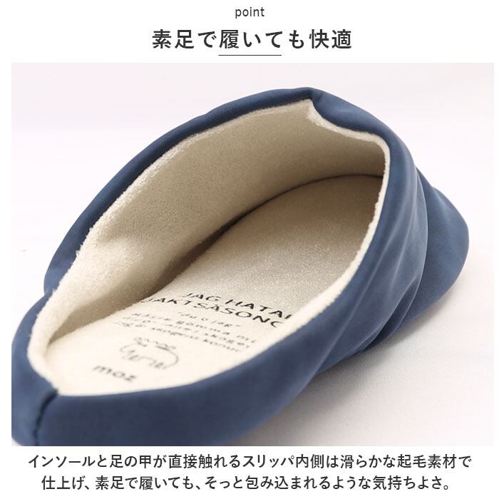 ・インソールと足の甲が直接触れるスリッパ内側は滑らかな起毛素材で仕上げ、素足で履いても、そっと包み込まれるような気持ちよさ。