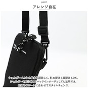 ・ショルダーベルトの長さを調節して、斜め掛けも首掛けもOK。ショルダーを取り外してバッグインポーチとしても活用でき、お好みやシーンに合わせてスタイルチェンジ。