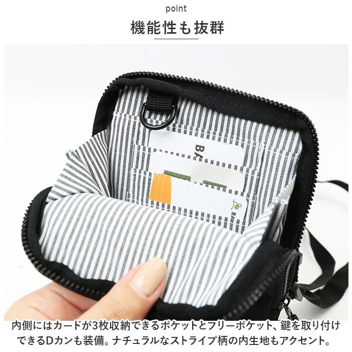 ・内側にはカードが3枚収納できるポケットとフリーポケット、鍵を取り付けできるDカンも装備。ナチュラルなストライプ柄の内生地もアクセント。