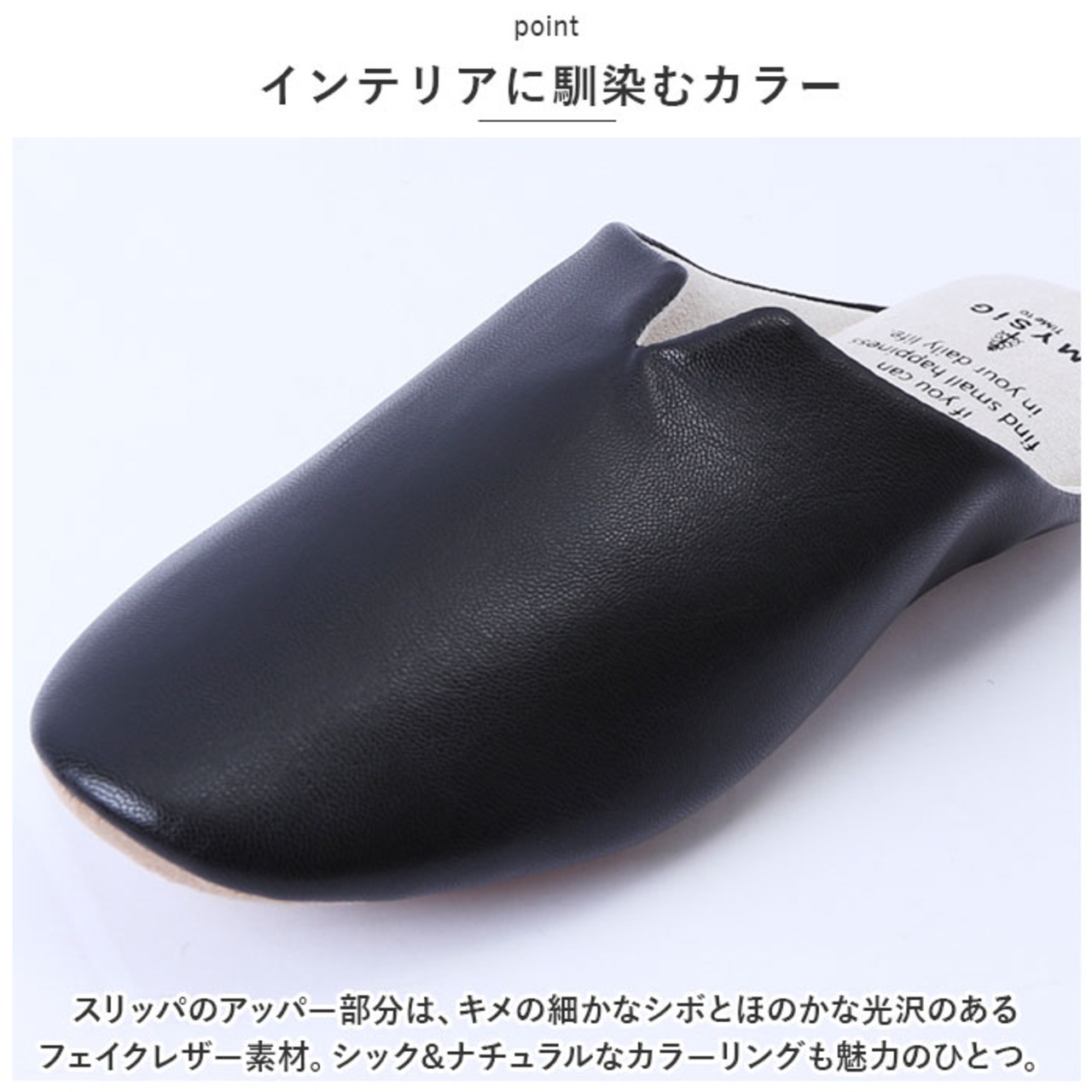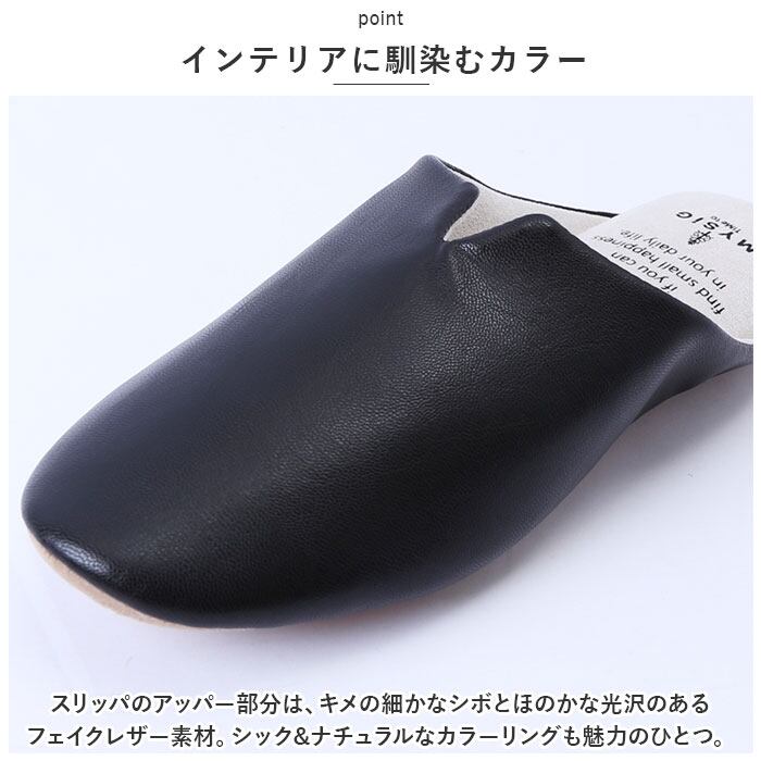 ・スリッパのアッパー部分は、キメの細かなシボとほのかな光沢のあるフェイクレザー素材。シック&ナチュラルなカラーリングも魅力のひとつ。