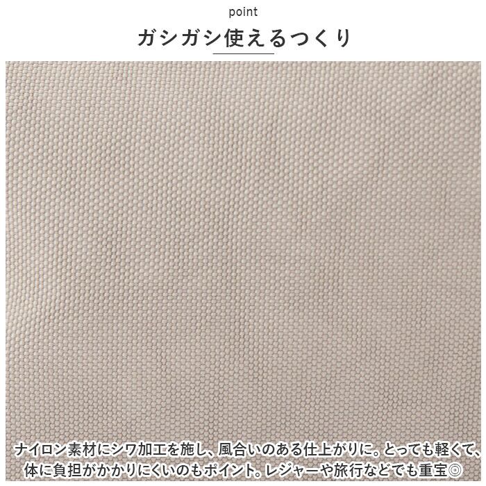 ・ナイロン素材にシワ加工を施し、風合いのある仕上がりに。とっても軽くて、体に負担がかかりにくいのもポイント。レジャーや旅行などでも重宝◎