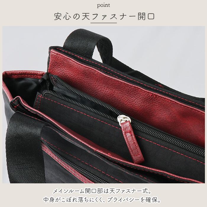・メインルーム開口部は天ファスナー式。中身がこぼれ落ちにくく、プライバシーを確保。