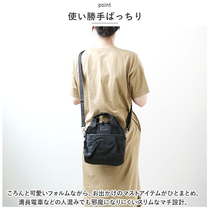 ・ころんと可愛いフォルムながら、お出かけのマストアイテムがひとまとめ。満員電車などの人混みでも邪魔になりにくいスリムなマチ設計。