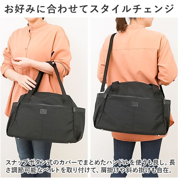 ・スナップボタン式のカバーでまとめたハンドルを使うも良し。長さ調節可能なベルトを取り付けて、肩掛けや斜め掛けも自在。