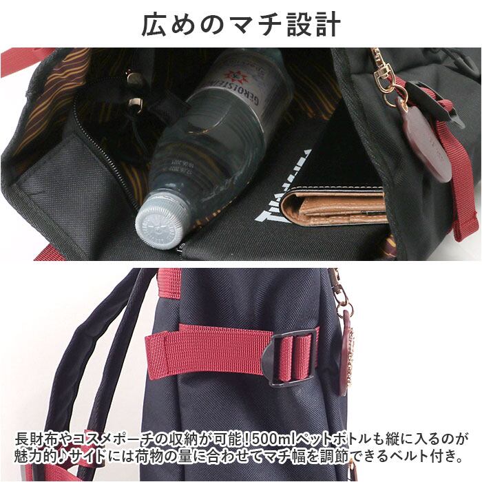 ・サイドには荷物の量に合わせてマチ幅を調節できるベルト付き。
