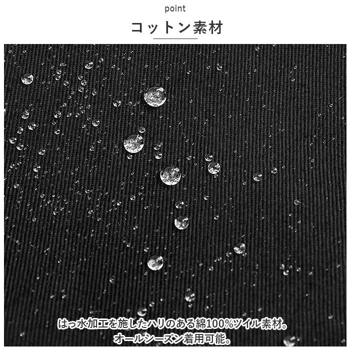 ・はっ水加工を施したハリのある綿100%ツイル素材。オールシーズン着用可能。