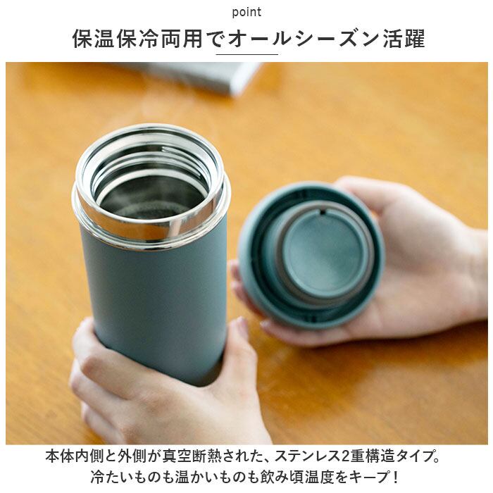 ・本体内側と外側が真空断熱された、ステンレス2重構造タイプ。冷たいものも温かいものも飲み頃温度をキープ!