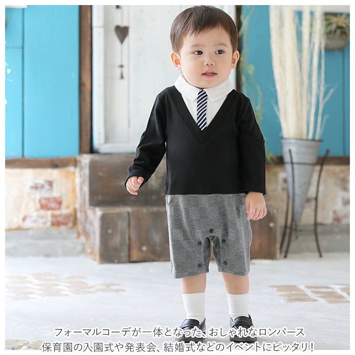 ・フォーマルコーデが一体となった、おしゃれなロンパース。保育園の入園式や発表会、結婚式などのイベントにピッタリ!
