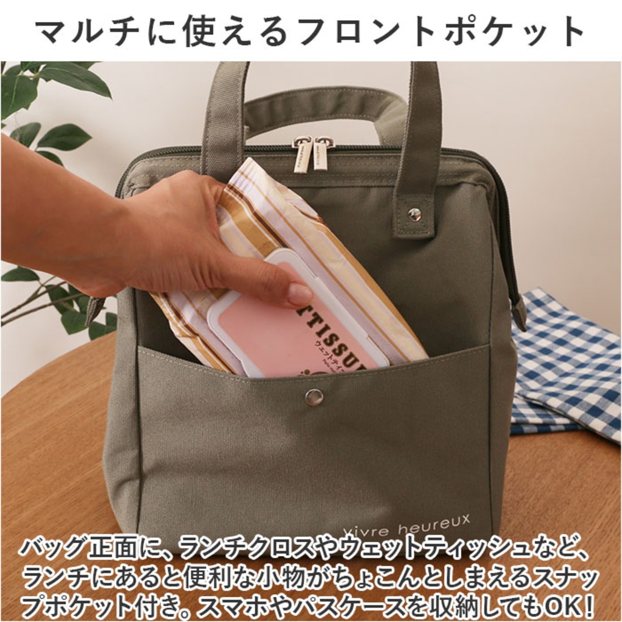 ・バッグ正面に、ランチクロスやウェットティッシュなど、ランチにあると便利な小物がちょこんとしまえるスナップポケット付き。スマホやパスケースを収納してもOK!